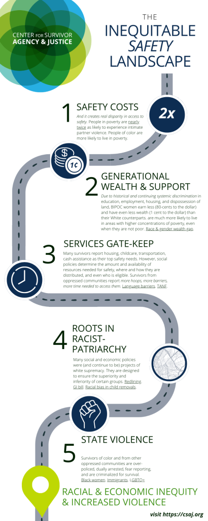 Safety for survivors requires economic security. Domestic violence creates financial hardship, and poverty, in turn, restricts survivors’ options for safety. While anyone can experience abuse, not everyone can access the resources and support they need to be, get, and stay safe. Survivors from oppressed communities are disproportionately impacted by domestic violence due to policies and systems that impede their access to resources and safety.